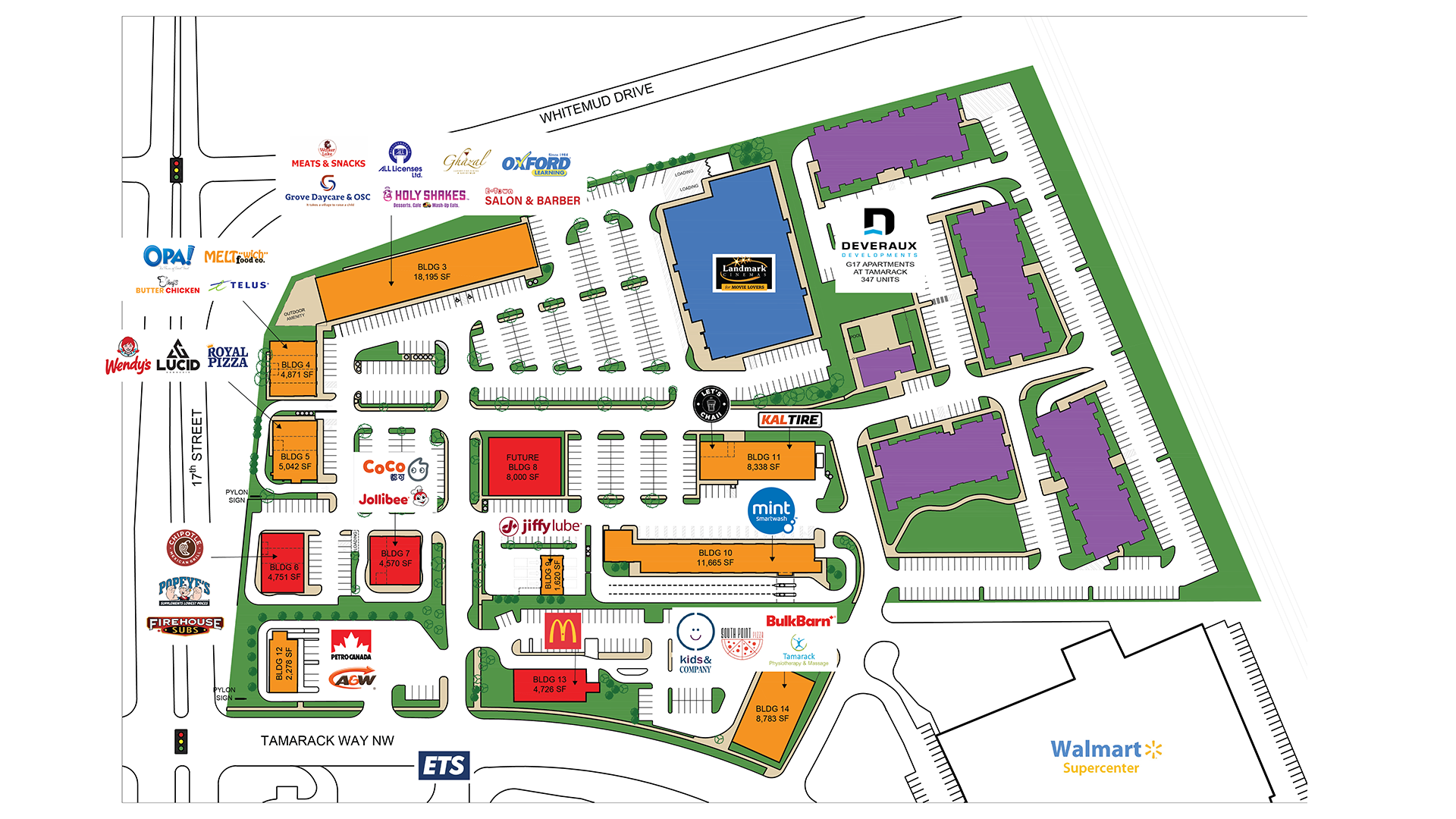 GROVE ON 17 is anchored by Landmark Cinemas and shadow-anchored by Walmart Supercentre. ETS Park & Ride, Real Canadian Superstore and Home Depot are also close nearby. The combined area totalling one million square feet of mixed-use development is ideally located to fulfill the destination, convenience and service needs of this large and growing community.